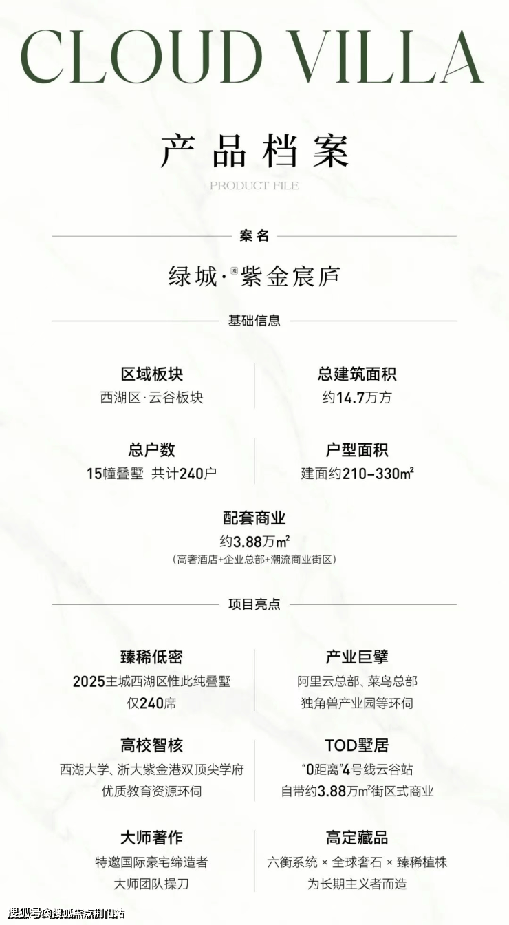 绿城·观紫金宸庐是位于西湖区云谷板块的低密楼盘,从拿地到首开,由绿城管理集团提供代建管理服务。园区很纯粹,15幢住宅全都是建面约210-330㎡的叠墅。