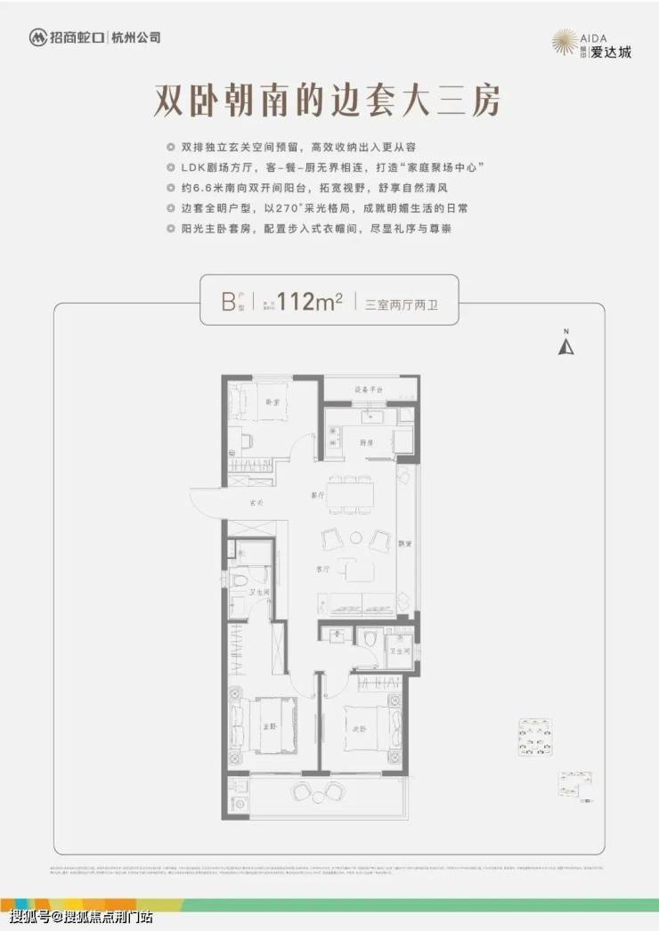 三房两厅两卫112㎡户型,主卧为套房设计,餐客厅一体,约6.6米的南向双开间阳台,客厅带大飘窗。