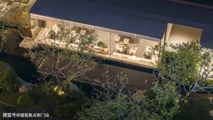 从约80米长的主入口展开,先是约1500方下沉式庭院会所,再是风雨连廊连接大面玻璃的景观架构,再向里又是大片的水系和景观绿地。