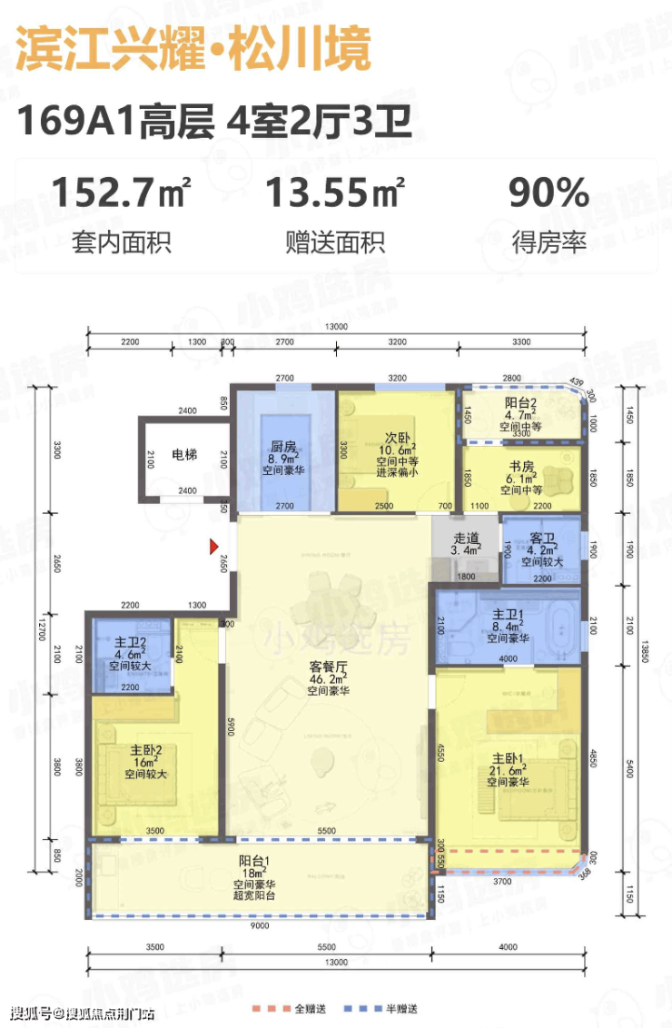 建面约169方户型,总价约700-820w,这个户型肯定抢手,一方面是户型本身优秀,另外总价段也直接错开了周边新房的竞争。