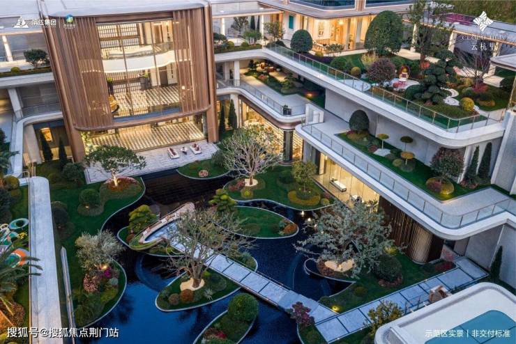 底下的水院里,是一个又一个树池,一层又一层跌水,一棵又一棵名贵的铁冬青。跌水层次越多,成本就越高,这样精致浓烈的庭院,很有辨识度,不输豪宅。