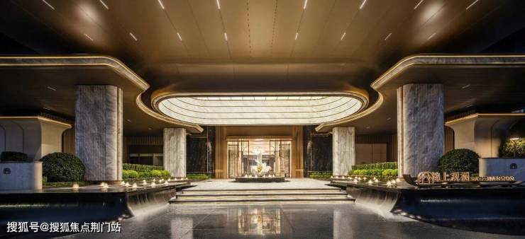 如果近距离看,项目的入口细节之处又不是奢华,尤其是大面积的奢石运用(梵高白奢石+古驰黑石材),绝对是大手笔,再搭配四根梵高白立柱托起古铜色铝板,层层抬升,豪宅大院的气质扑面而来。