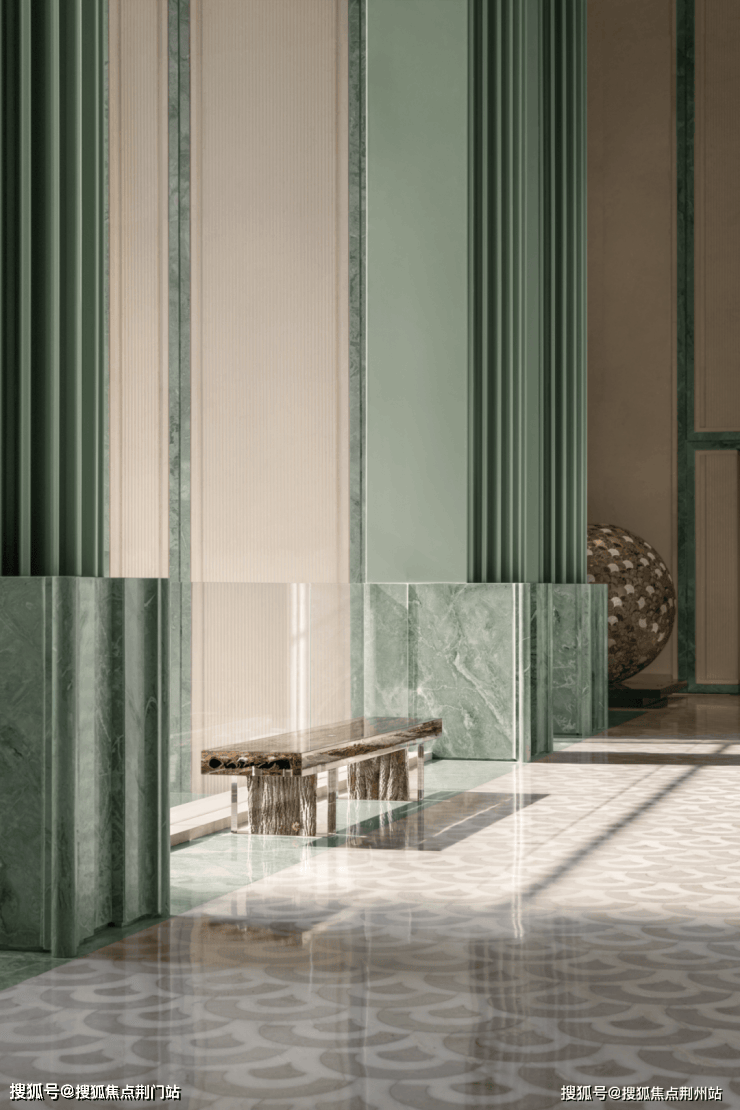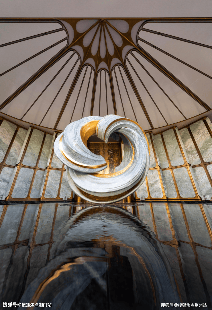 “玉镜流光”雕塑,大堂内八根巨幅立柱,还原了扇骨的形态,汝窑冰裂纹的陶片镶嵌,地面拼花运用江南花窗元素,共同铸就了杭州世家恢弘门仪。