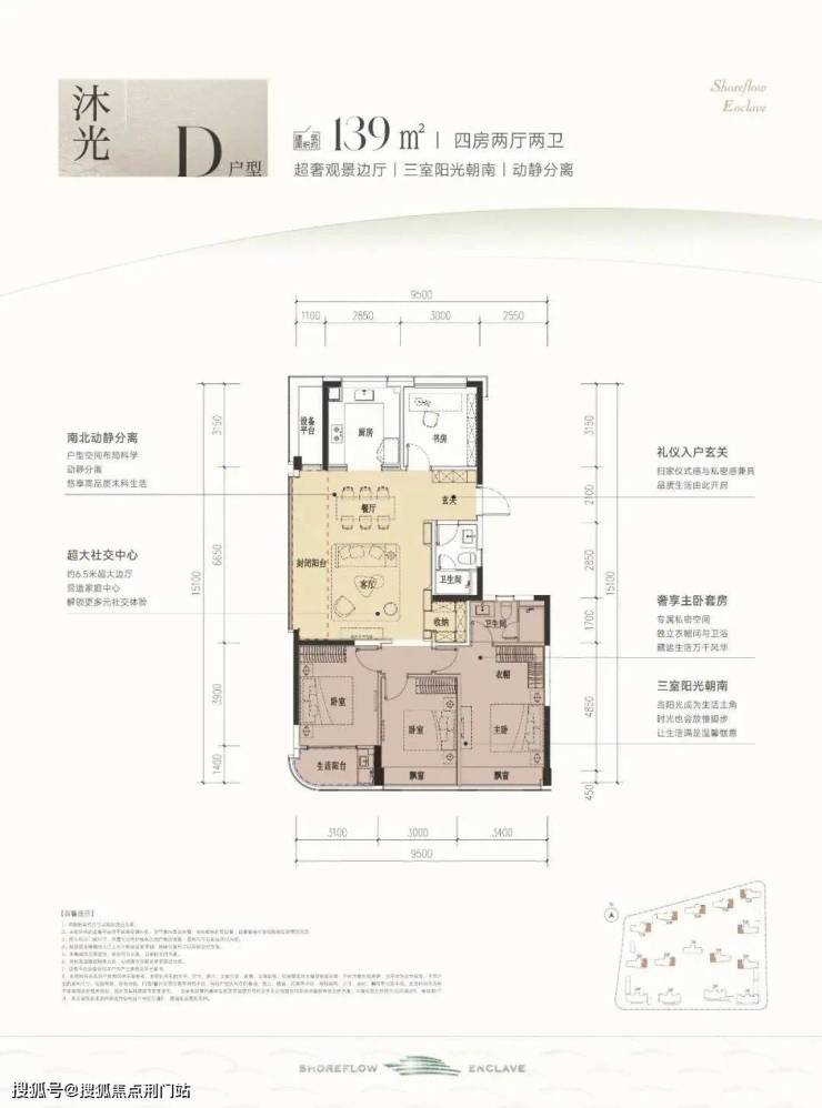 约120㎡B户型做到四开间朝南,约13米南向面宽搭配双联阳台,套房主卧与双飘窗设计营造大平层气场。