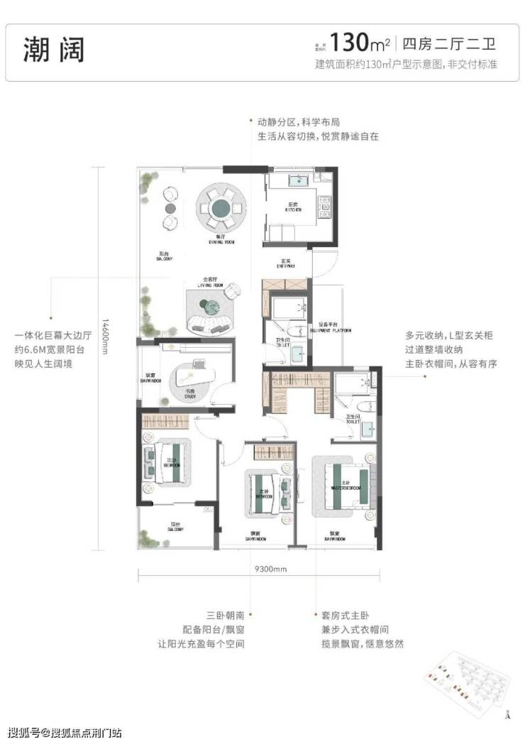 建筑面积约130㎡打造全明大四房,三卧朝南,配以270°巨幕边厅,造极“全面屏”环景视野。