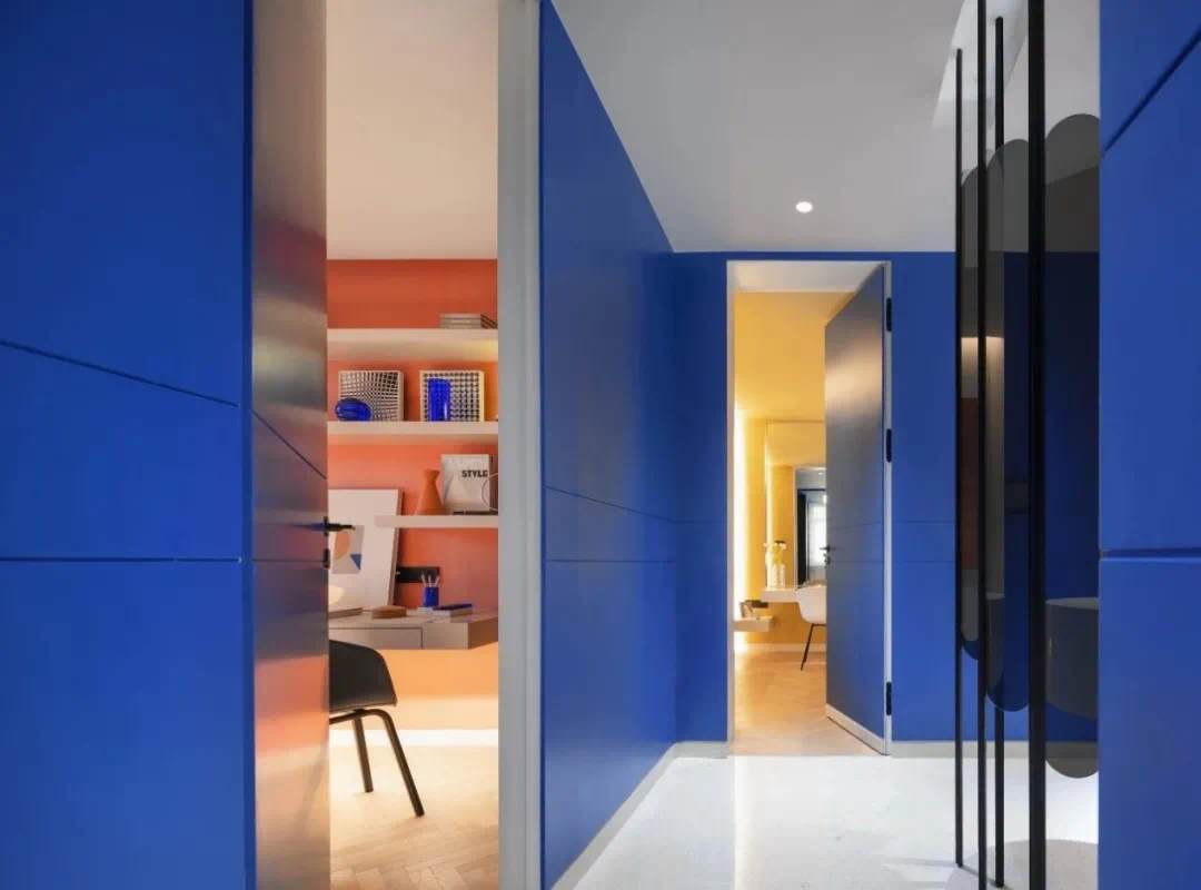 再看内里,大面积的使用了橙色和蓝色这两种色彩,让人印象深刻。我敢说,只要看过这个样板间的客户,会在很长的一段时间内会想起它,这也是一种揣摩用户心理的方式,样板间设计者的目的完全达到了