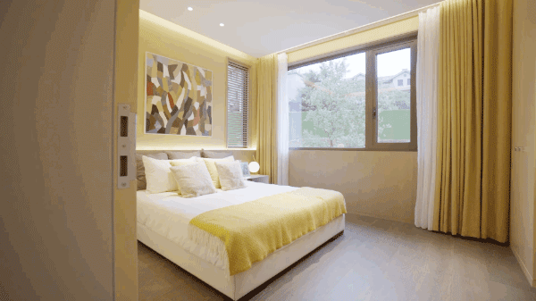 这种全黄色系的卧室,也是给人一种舒适感。当样板间给人家的感觉后,那么对家的幻想可能就会投射到这个样板间上,就会提升客户的购买欲望