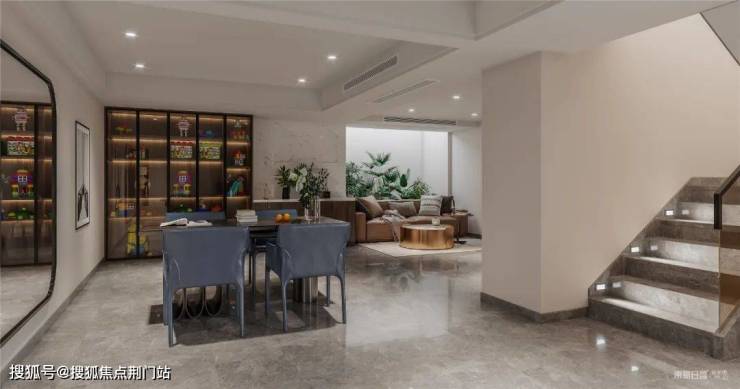 步入地下一层,餐厅与客厅相通,沙发背后的竖井景观,让整个家的空气都变得通透明亮清新。家具都是沉稳的咖色系,给居者一种舒适高级的感受,打开通顶展示柜中的灯,亮度和氛围直接拉满,让空间看起来更加的质感大气。