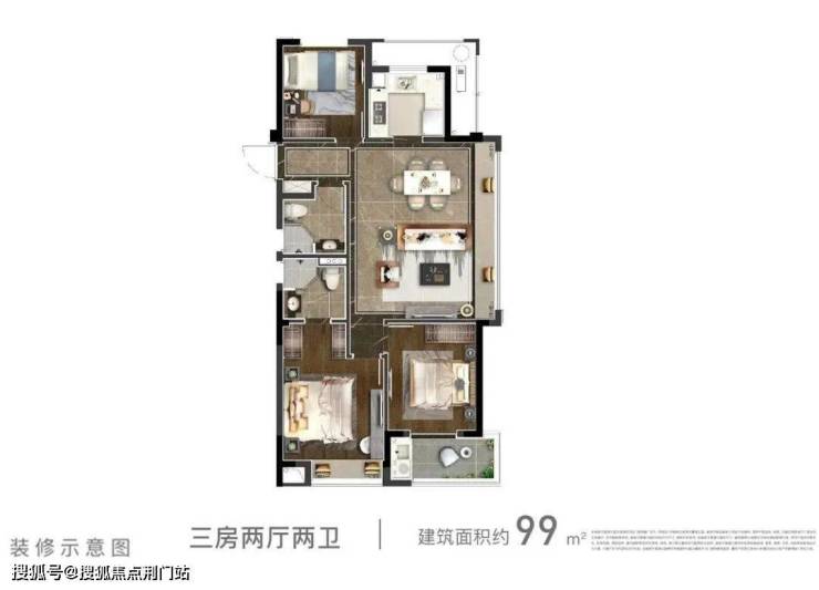 建面约96-99㎡大三房两卫,则把空间利用发挥到了极致,面积虽小,但空间有序,张弛有度。