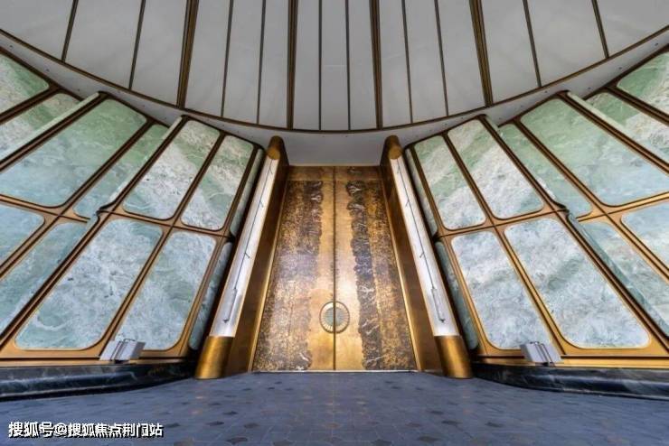 比如约56x11.5米的超尺度门庭,顶部以杭州折扇为造型灵感,寓意“藏风聚气”;四周还有12片巴西进口的百达翡绿奢石雕琢的玉石屏风;中间还有约9.6x5.3米的巨幅铜门,是由非遗传承人朱炳仁手工锻打,再现钱塘潮涌的磅礴气场。