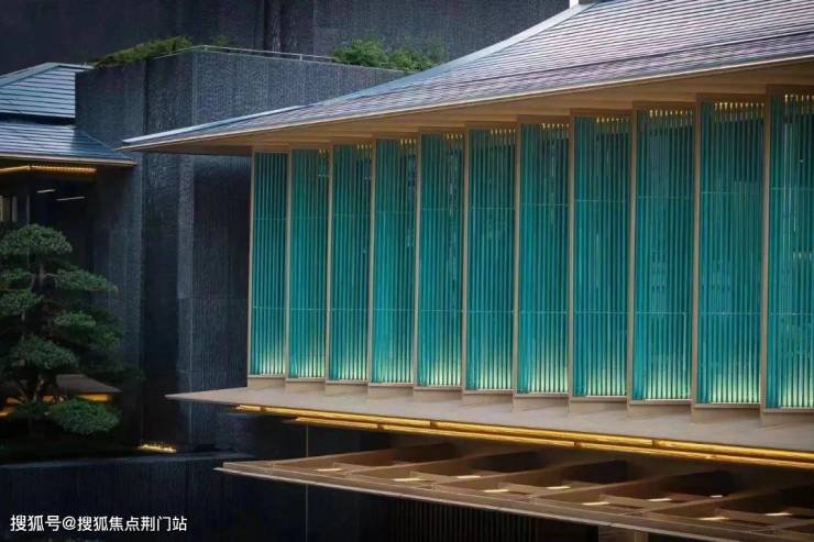 在立面打造上,提取“宋画”中的线条感,提取歇山顶样式,转译形成深远的挑檐,在视觉效果上给人以棱角分明、结构清晰之感,整体呈现一种清雅内敛的当代气质,大尺度巨幕玻璃窗镶嵌金色铝线条,如画框一般,攫住窗外的每一寸风景,让建筑隐于自然