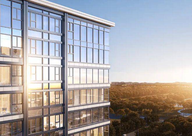 外立面采用金色铝板+玻璃设计,蓝宝石水系等豪宅级配置