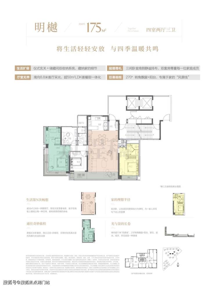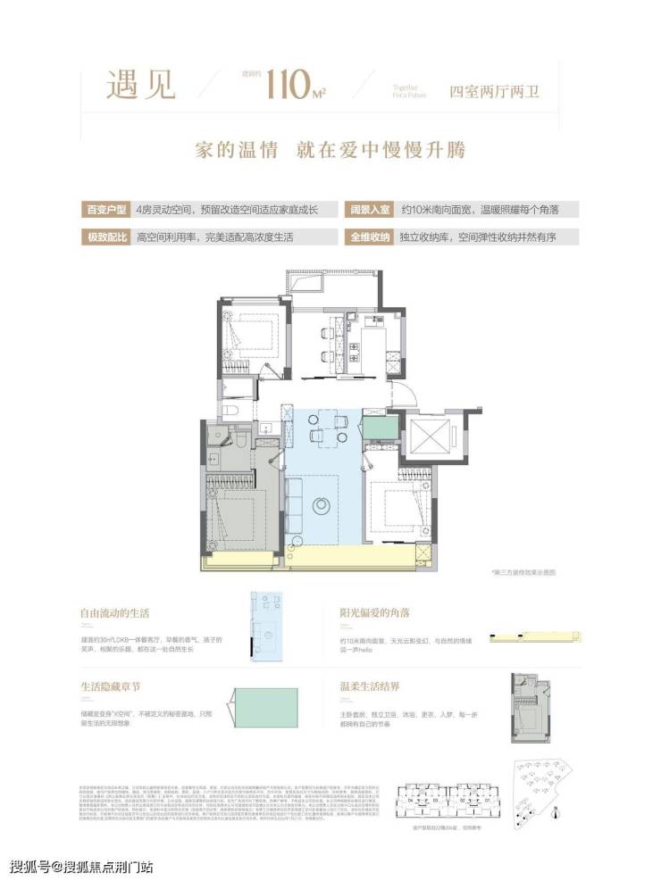 其空间布局精妙,四开间朝南,南向双联阳台,一边生活休闲,一边晾晒家政,既有诗意又不失体面。