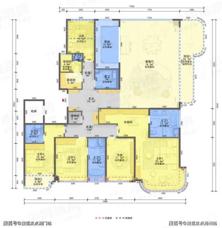 ❶高层建筑面积约496㎡户型,7房2厅6卫,3梯2户,含赠送得房率约94%。