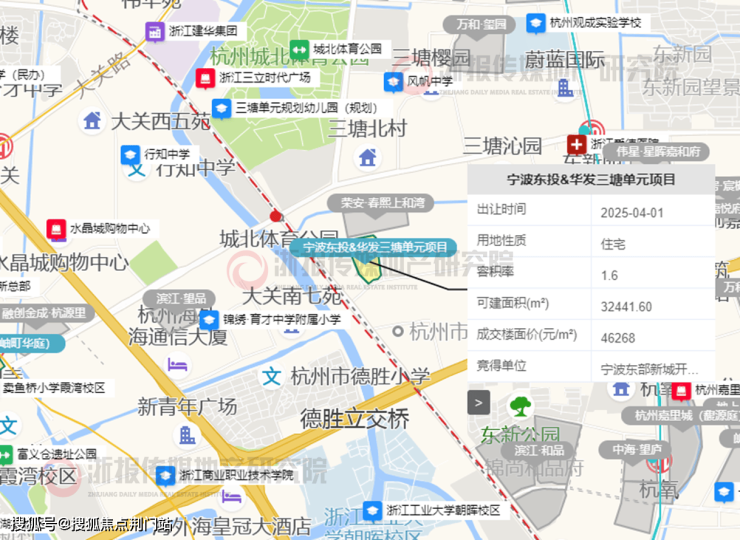 2025年4月初,宁波东投以总价15亿元竞得三塘单元的杭政储出[2025]28号地块,折合楼面价46268元/㎡,溢价率约54%,项目名为“武御林宸院”。