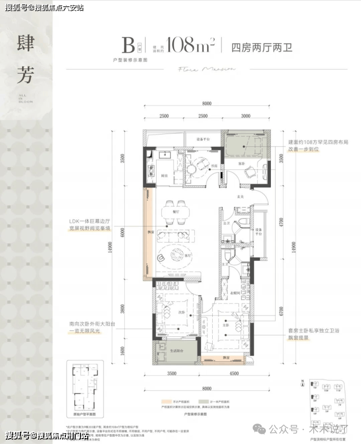 一个是 建面约108方,不仅实现了四房功能,还是年轻人非常喜欢的边套设计。