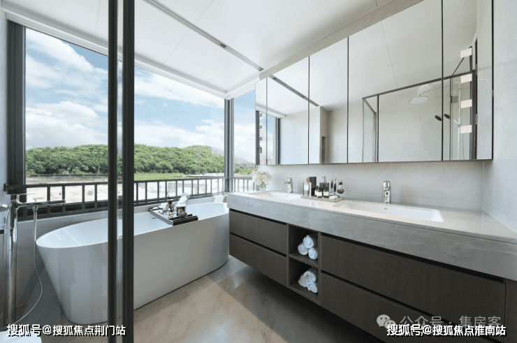 公建化的立面,四面铝板搭配大面积玻璃,阳台统一封包,底层的浅色天然石材还被打磨出弧线,脱去厚重外壳,轻盈洒脱。项目西侧直线约800米就是钱塘江,春来晴翠也在园区里编织了一幅山水画卷。