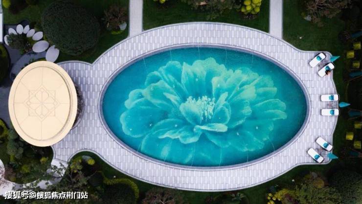 戏水池边上的吧台细节很繁复,空间尺度也够大,它们一起构成了一个高级的「露天泳池会客厅」。