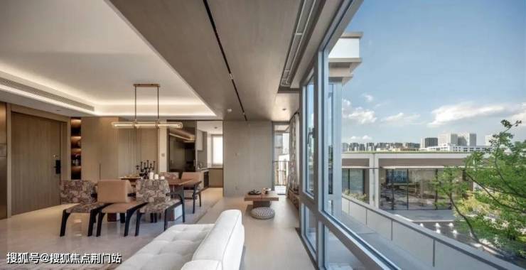 建面约103㎡的边套更是堪称神迹,将小户型的空间魔法玩到了极致。 客厅到阳台的地面、 天花直接拉通, 甚至两侧的墙垛都已隐身, 整个餐客厅面积达到约35㎡(含阳台),这可是140㎡以上大宅才有的空间感!