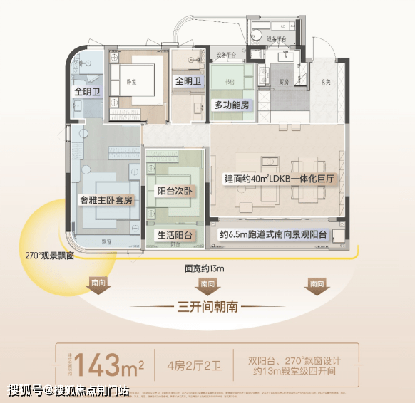 约143㎡户型,约13米南向巨幕面宽+约6.5米多功能阳台,形成IMAX级环幕视野。LDKB一体化边厅达40㎡,配合岛台,中西双厨与餐厅构成洄游式社交核心,媲美钱二奢宅的“泛会所”体验。