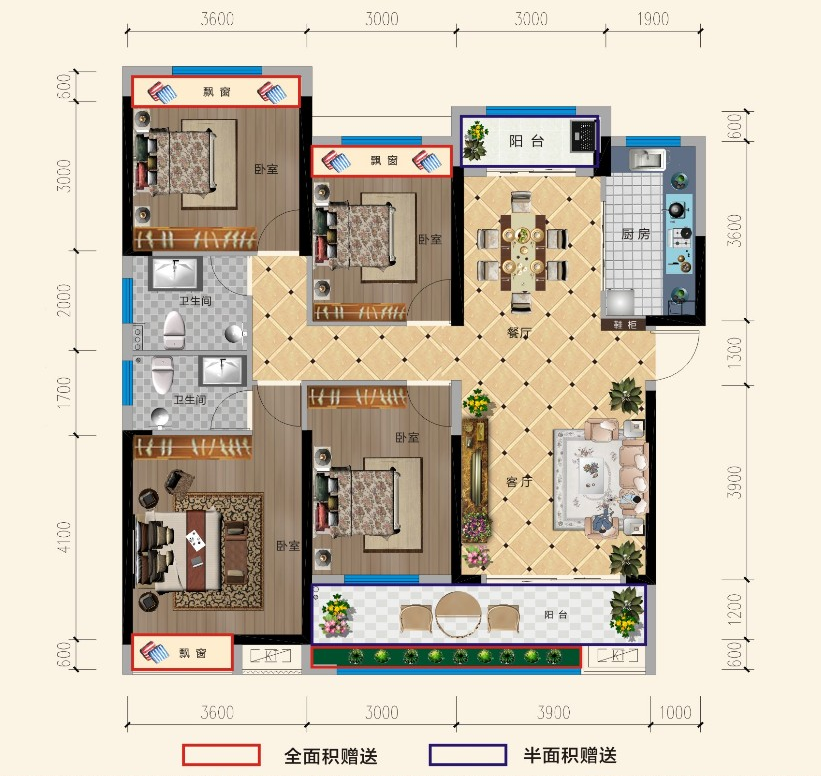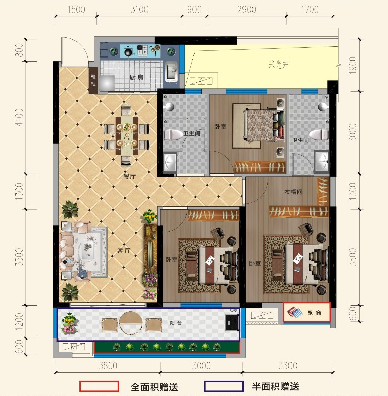 得房率高,赠送面积大