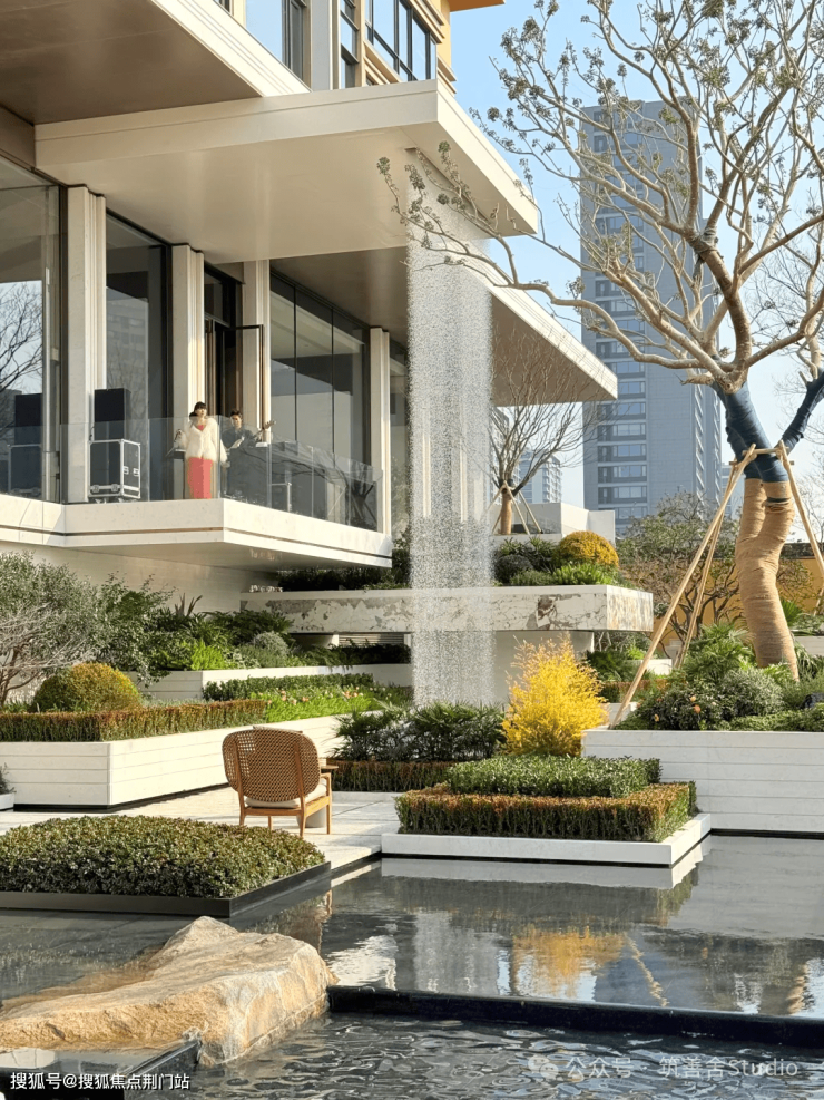 项目将大面水景置于社区前场,结合绿植、流瀑、雕塑等,构筑了令人印象深刻的入口界面。