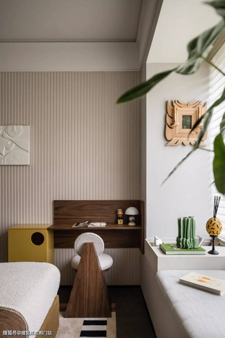 主卧是一个有着大窗的舒适空间。色调延用了客餐厅的基础色调,造型各异的灯具为整体空间带来温暖与舒适之感。黑白、深深浅浅的棕色以及红棕色拥有复古简约的魅力,但奇妙在于其中各种纹路的集合,碰撞出高级隐匿的艺术感。