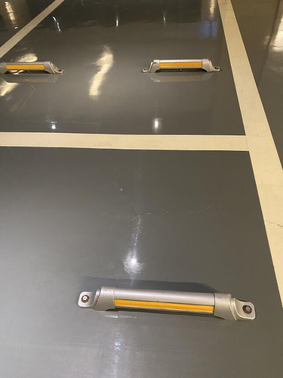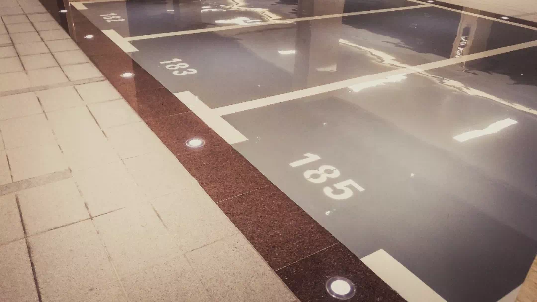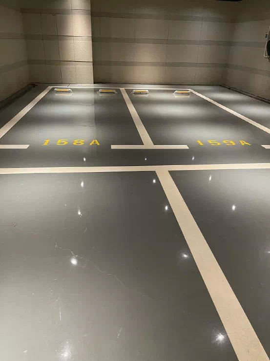 车位的地面材质内部用了镜面的环氧树脂,充分保证了私家车轮胎的健康,防滑且耐用。