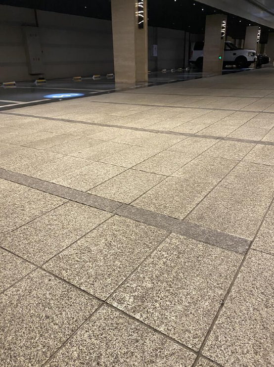 一进到车库,脚踩的是花岗岩铺装的行车地面,所有车道地面选用的全部都是石材。