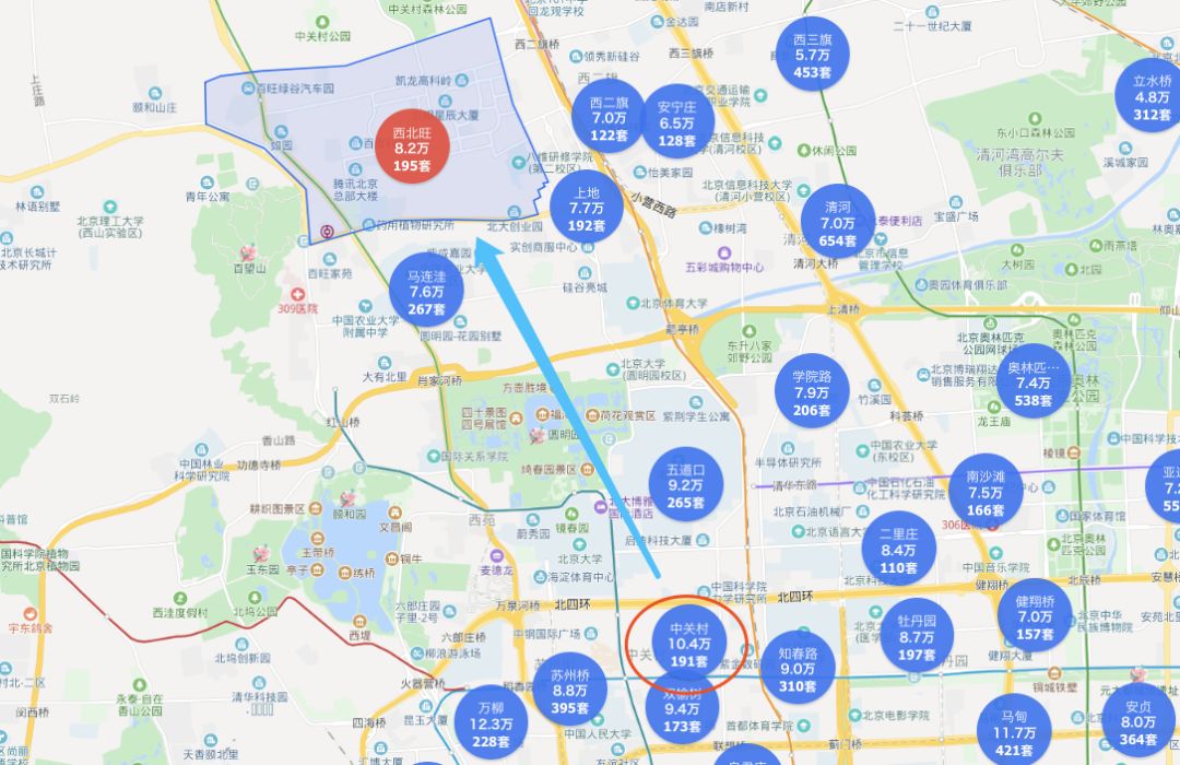 而相对中心就不一样了,会随着时间的推移而发生转移。例如北京海淀原来的中心区在中关村,但现在随着百度、腾讯、网易等大型企业将办公位置迁移到西北五环外的科技园板块,后者就成了海淀的新中心。随之,新中心旁的西北旺房价在短短几年翻了好几倍,达到了8.2万元/平米的高价。