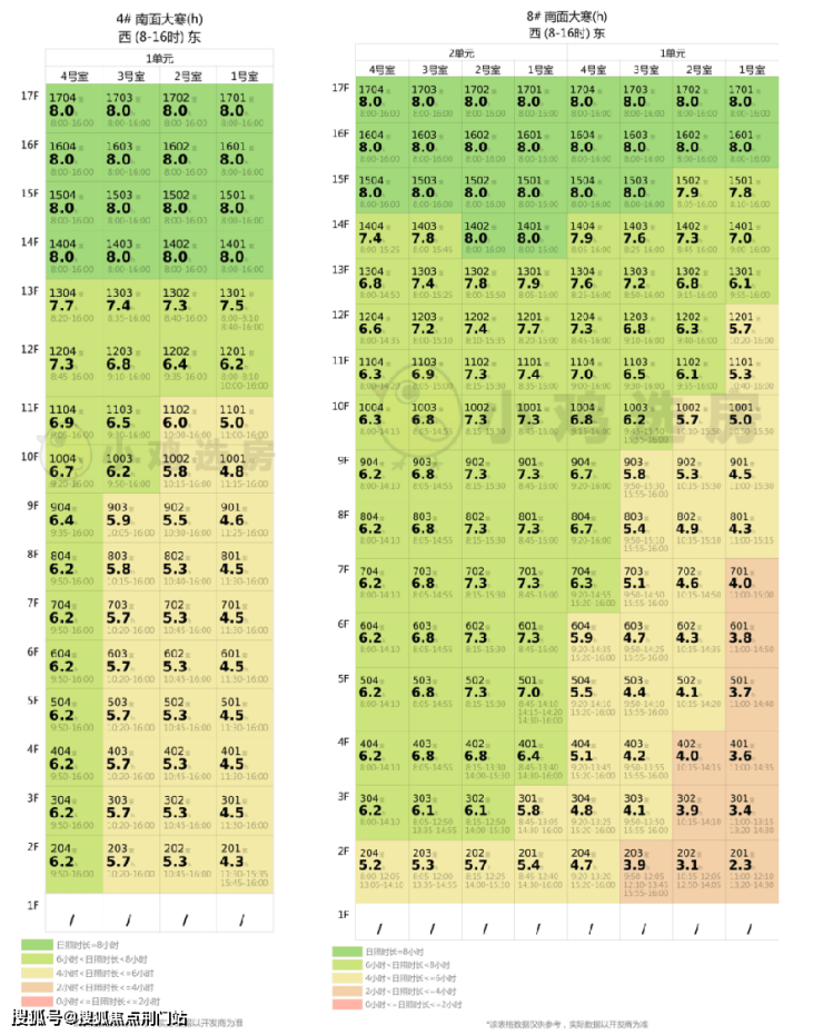小鸡的数据里,我们可以看出,这两幢的数据表现非常出色。绝大多数的房源都有4小时以上的大寒日日照时长。就连低楼层,4#的日照时长也有5小时左右;8#从3F开始,就有大部分房源达到了6小时以上日照时长。出色的采光数据,直戳心窝。