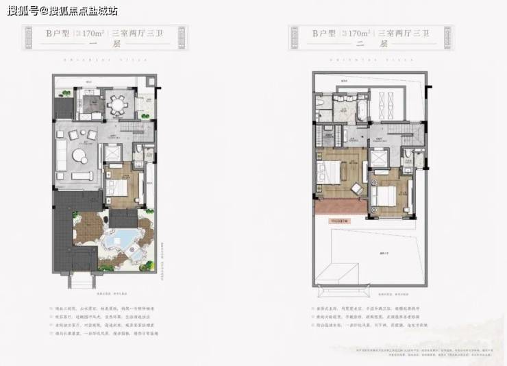 以春江御园建面约170㎡中式合院为例,南入的这处庭院位于前庭,回到家第一眼便是小桥流水,同时南北三庭院的配置,在家中即可实现移步换景。一楼餐客厅分离式布局,娱乐就餐两不误;老人房朝南设计不仅踏实接地气,还能直面小院品味多彩时光。