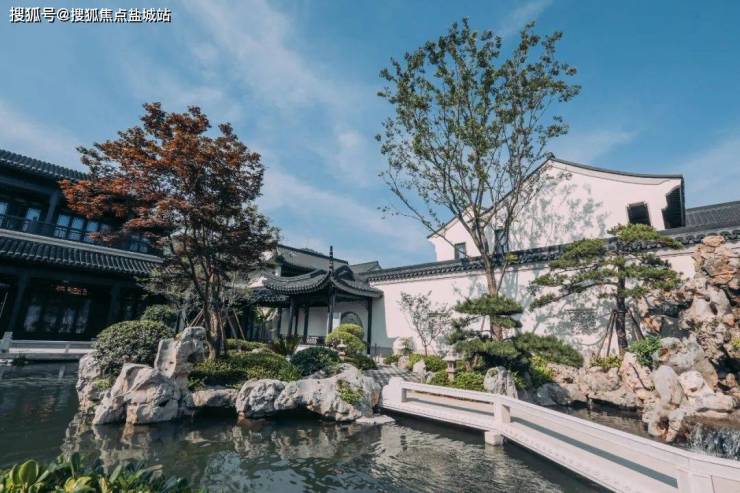 江南园林甲天下,苏州园林甲江南,比如像我们现在看到的园林布局,就是经典的苏州园林景观,讲究引水入园。造景围绕着这片水景展开,空间上比较有层次感。近景是流水、堆石,中景是连廊、假山,远景是中式合院的院墙、屋檐。