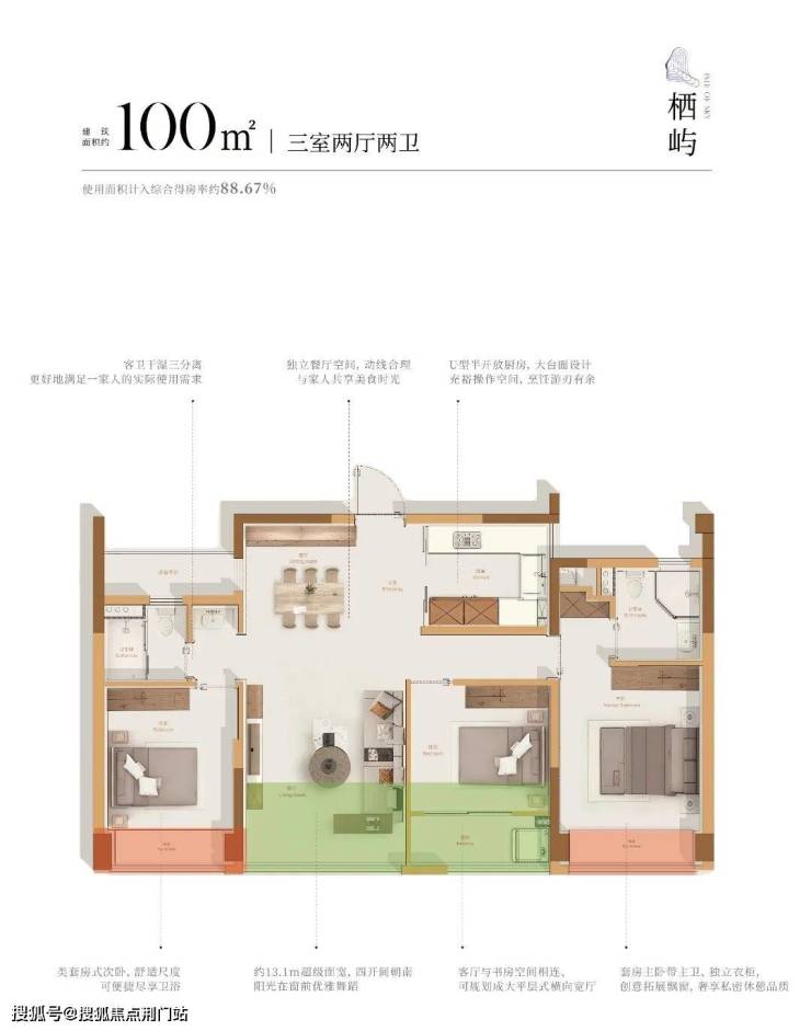 建面约89-104m²的三房、建面约115-132m²的四房,最高实际得房率达到100%,是目前杭州得房率最高的新盘之一!