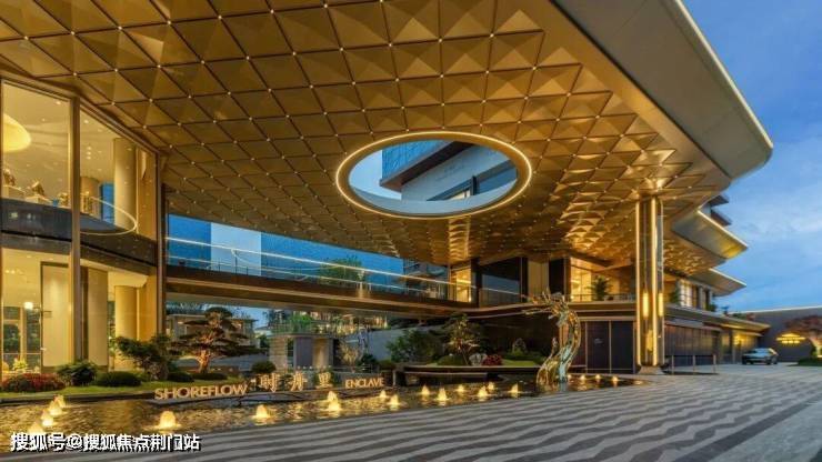 与这两年流行的“阔绰”门头相比,这座鎏金门头最大的亮点是通透——不仅顶部有一个圆形的镂空,偏置的大堂也为风景让了路,正前方没有任何遮挡,反而把最精彩的立体花园化作一幅动态图景,点缀了整条街道。