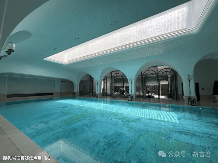 上面是地上会所,还有一个地下会所,层高8米多。层高一旦上去,许多功能空间就显得尤为大气,比如这个泳池,而且还做了屋顶采光。