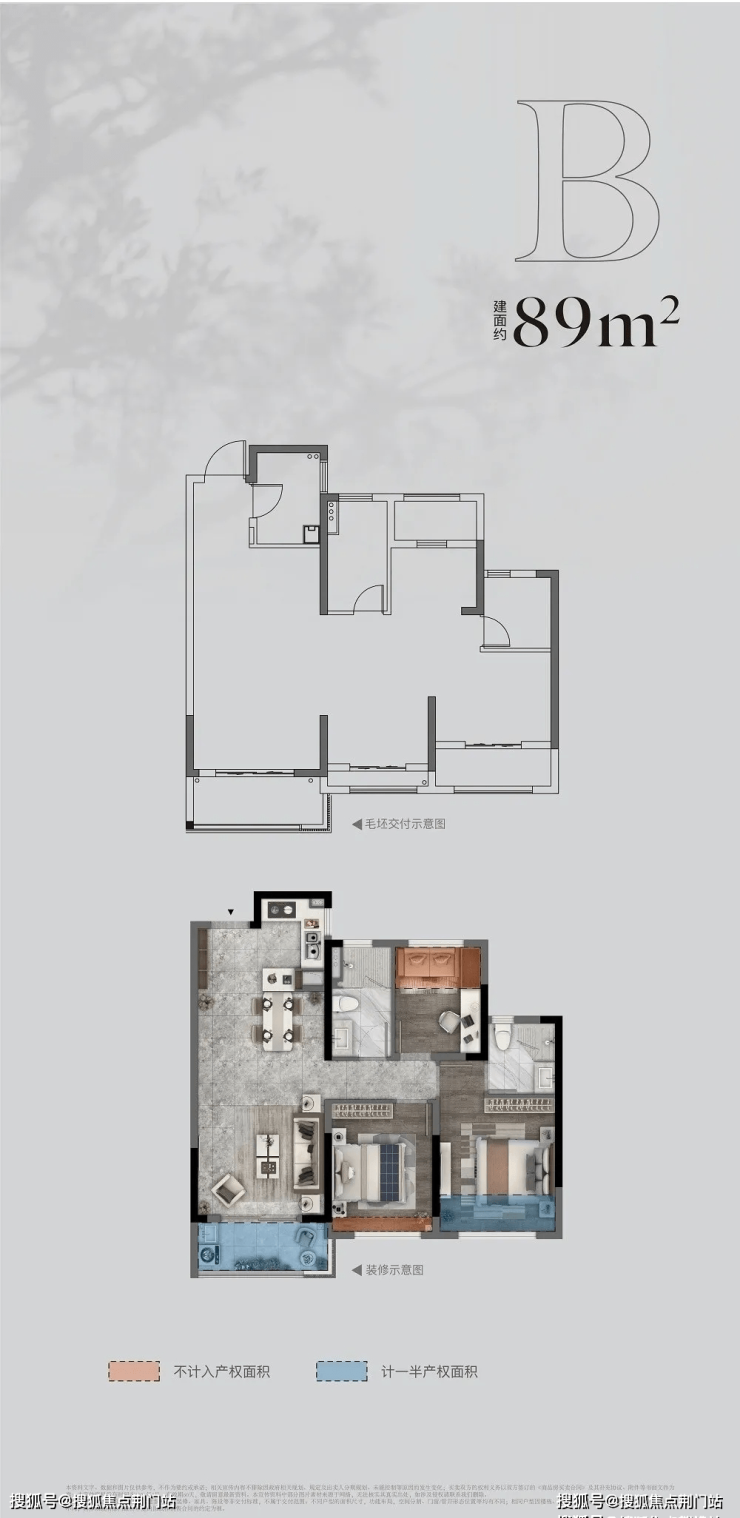 相关阅图:国风源赋高层主推89㎡的三房以及115㎡四房,最大的亮点就是户型的附赠面积较多,得房率比较高、这是一个紧凑型的户型,89㎡做到了三房两厅两卫,是目前市面上比较少见的小面积三房。因为主卧带有一部分是计一半产权面积的赠送,南向次卧和北向次卧都拥有很大一部分赠送面积,所以各个房间的空间感都比较好。