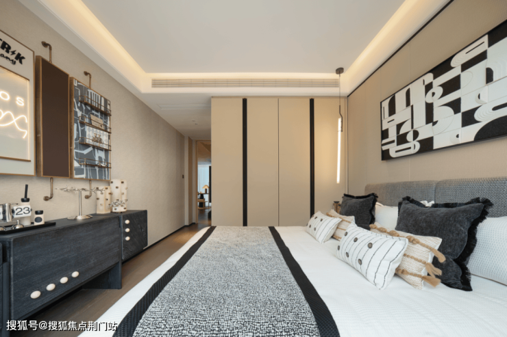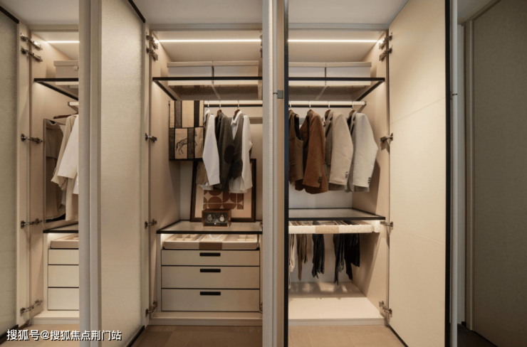 拾级而下的主卧套房,像被温柔包裹的梦境。接近5米长的衣帽间里,皮革门板缀着夹丝玻璃,柔和灯光漫过分区收纳的衣物,连梳妆镜都闪着细碎的光。