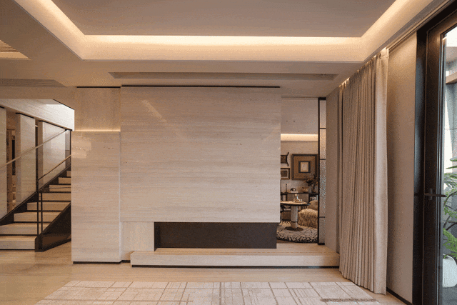 背景墙的叠层设计暗藏巧思,搭配移门打造开放式互动书房。关起是安静的居心地,打开便成了客厅里流动的风景。