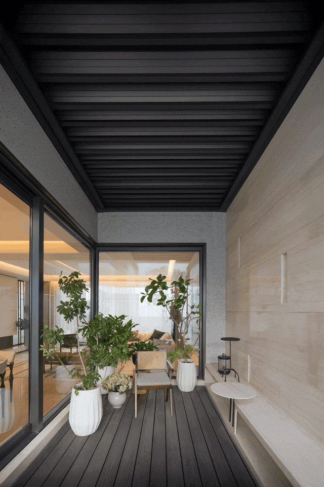 北向露台地面瓷砖更换为户外木地板,顶面增配电动铝合金天幕,可开可合。墙面材质升级为天然大理石,结合精心设计的户外灯光系统,共同营造出更具品质感的户外空间氛围。