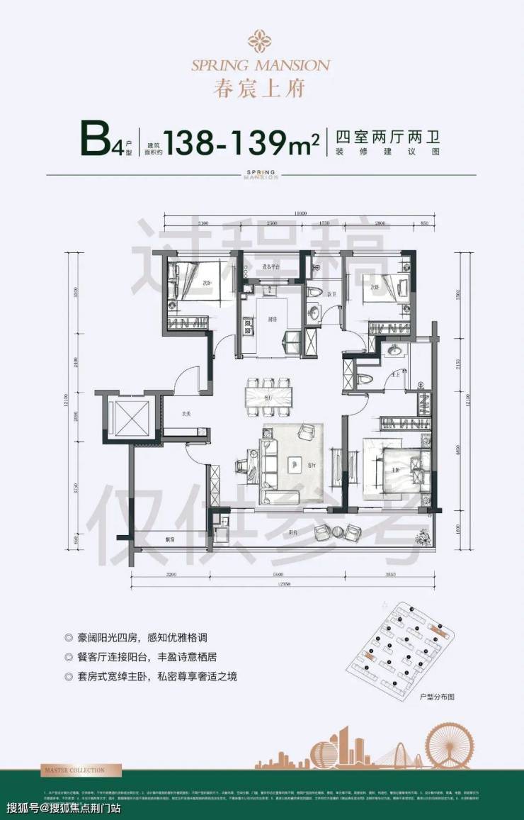 建筑面积约139方的四房户型则带来更宽奢的空间体验。经典的“四叶草”格局,保证了动静分离,家庭成员间互不干扰;客厅5.5米的面宽傲视群雄,除了常规的电视、沙发外,还留有足够空间让业主自由发挥,再摆下一张书桌、钢琴甚至健身器材都不在话下;主卧套房式设计、3.7米的宽度,则带来更大户型才有的阔绰体验;所有卧室10㎡以上的面积尺度,使每个房间都能物尽其用,即使二胎家庭也能将每个孩子安排的妥妥当当。