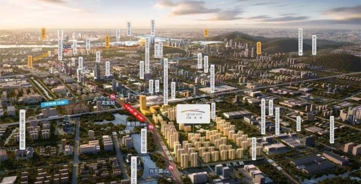 龙安湖公园实景图【规划价值】滨纷之城——约63万方TOD复合生活场【滨纷感】五大业态交织,复合璀璨的“生活主场”项目总建面约63万㎡,交融居住、公园、商业、办公、学校5大业态,规划打造公园、商业、邻里中心、双幼儿园、九年一贯制学校等复合内容,联动周边城市资源,构建面向青年的缤纷生活场。