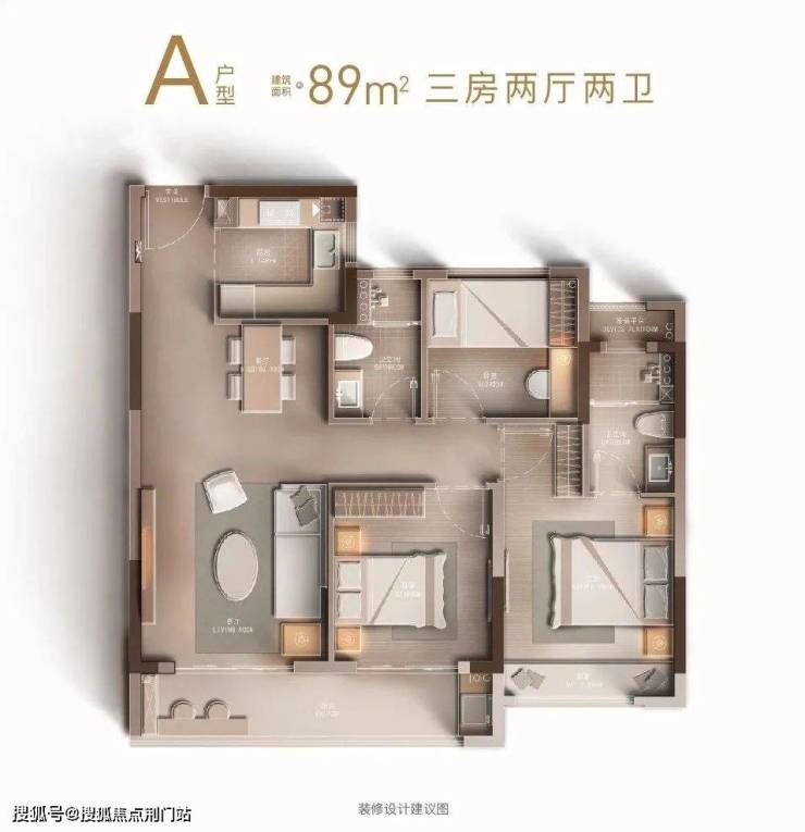 建筑面积约89㎡户型做到三房两厅两卫,三开间朝南,主卧还配有独立卫生间。南向建筑约6.4米阳台。还有开放式的餐客厅一体化设计,舒适宽敞。
