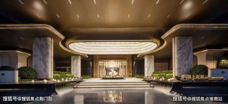 宽约78.8米、高约9.2米的大门,奥映鸣翠同款的梵高白石材,温润大气,与古铜色铝板的搭配,透出古典的韵味又不失轻盈。传统建筑穹顶元素也进行了现代化演绎,到了晚上灯光亮起,就变成了金碧辉煌的藻井。