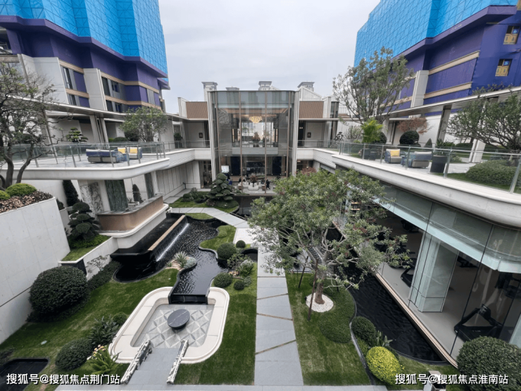 滨江经典的热带园林景观,种满了高大的热带树种;除了下沉式庭院中的水景外,园区中央还有一座异形景观水池。