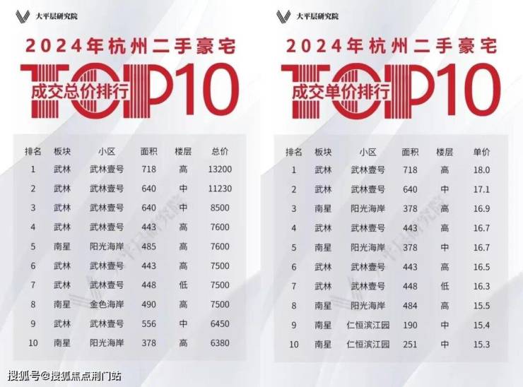 根据大平层研究院的数据,2024年杭州二手高层豪宅成交的单价和总价的TOP10中,滨江一家包揽,遥遥领先,没有竞品。
