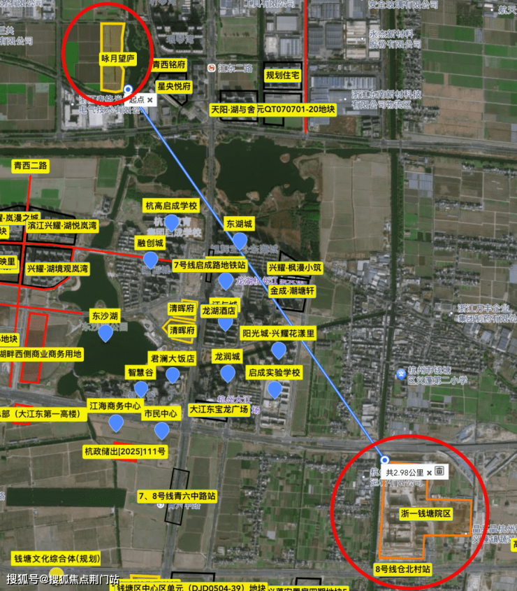 纵向的青六路,跨过东沙湖直连江东大道快速路、钱塘快速路,过江仅需一首歌的时间,去武林广场也仅仅30分钟左右。