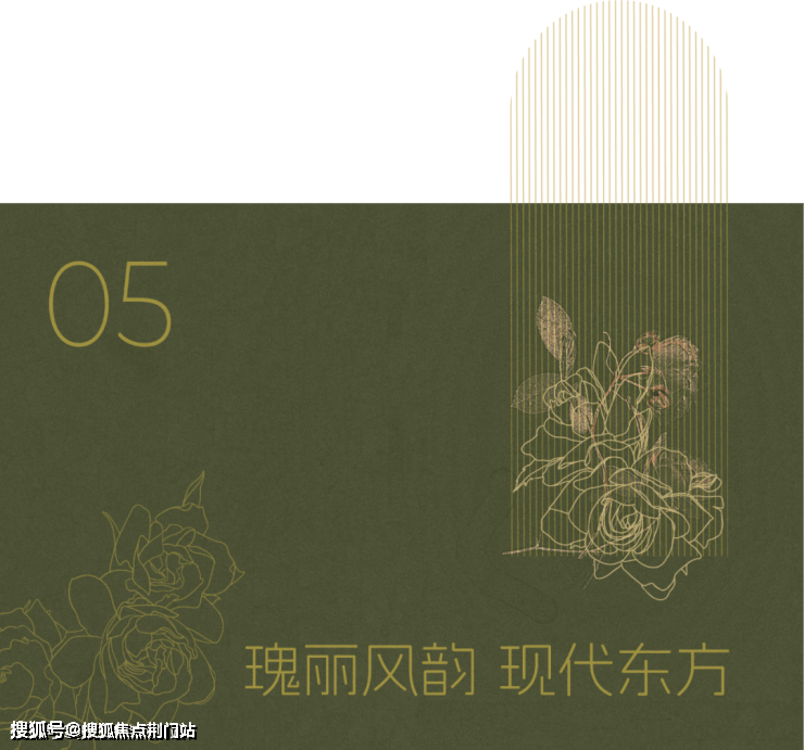 在材质的运用上,主张自然高奢主义,注重自然元素的运用与材质的混搭。将奢石、不锈钢、仿古铜等现代材质进行简化与组合,以模仿”金镶玉“的传统装饰效果,应用于整体立面设计之中,突显东方瑰丽气质。在色彩上相应的提取朱砂、琥珀、翡翠等极具东方韵味的瑰宝色系,应用于主体建筑与景观空间,呈现奢华馥郁质感。