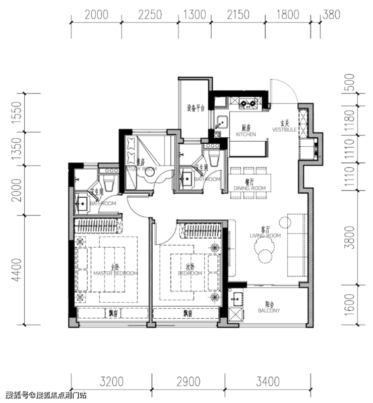 如果想要四房的户型,建面约108方也能满足,而且还是更多人喜欢的餐客厅一体大边厅设计,总价也不过200万左右。