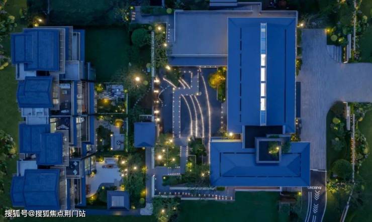 除了成片成片的品蓝色陶瓦+金属包边檐瓦,主入口形似波浪的直棂窗、会所的一长排立面屏扇,还借鉴了更高贵的秘色瓷(带绿的蓝色)。加上大片的灰蓝色玻璃,形成“蓝”之底色。